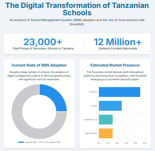 This created a critical opening for local entrepreneurs to build solutions from the ground up, designed specifically for Tanzanian schools. In this arena, ShuleSoft has emerged as a formidable market leader. Founded with a deep understanding of the local context, ShuleSoft has successfully onboarded over 600 schools by offering a product that speaks the local language—both literally and figuratively.