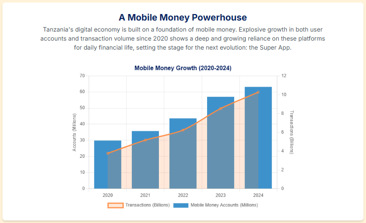 The entire contest is built on the foundation of mobile money. With a transaction value of $80 billion in 2024, it is the undisputed bedrock of Tanzania's digital economy. However, the system is still tied to its legacy. Most transactions happen via USSD, and a deep-seated habit of "cashing out"—immediately converting digital money back into physical cash—persists. The central challenge for any aspiring Super App is to break this cycle and create a compelling digital ecosystem where users want to keep their money online.