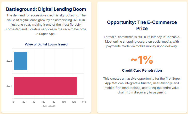 - Digital Lending is the engine. The digital credit market in Tanzania is exploding, with the number of loan accounts surging by nearly 200% in 2023 alone. For users, instant access to small loans is a powerfully "sticky" feature that locks them into an ecosystem. For providers, it's a profitable revenue stream and, more importantly, the primary source of the rich user data needed for credit scoring and cross-selling other products.
